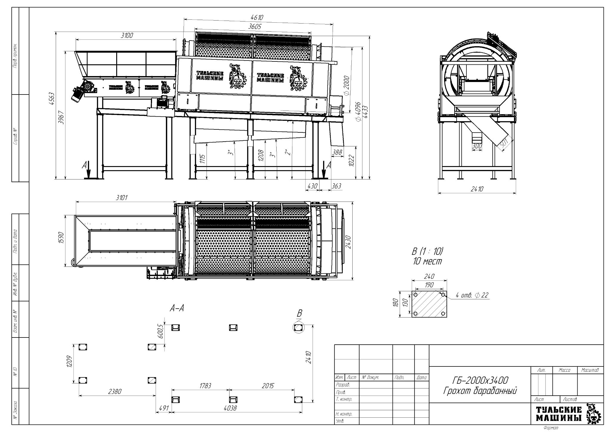 Конструктивно барабанный грохот представляет собой наклонный вращающийся цилиндр, поверхность которого оснащена просеивающими ячейками заданного размера. Основные узлы установки включают: