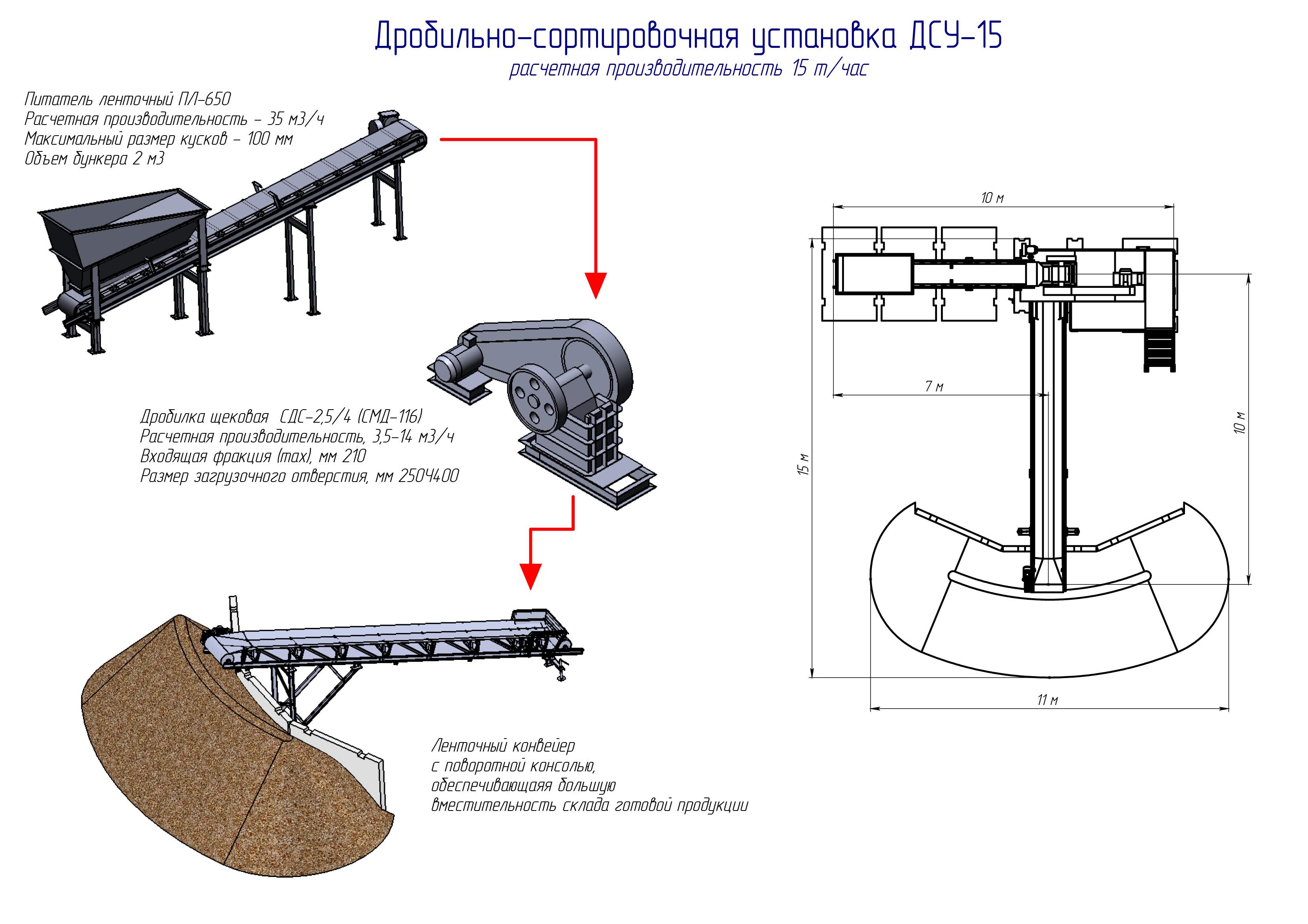 ДСУ-15 – дробильная установка, представляет собой одностадийную технологическую схему, назначением которой является получение несортированного щебня, измельчение горных пород, а так же переработка каменных и железобетонных элементов.