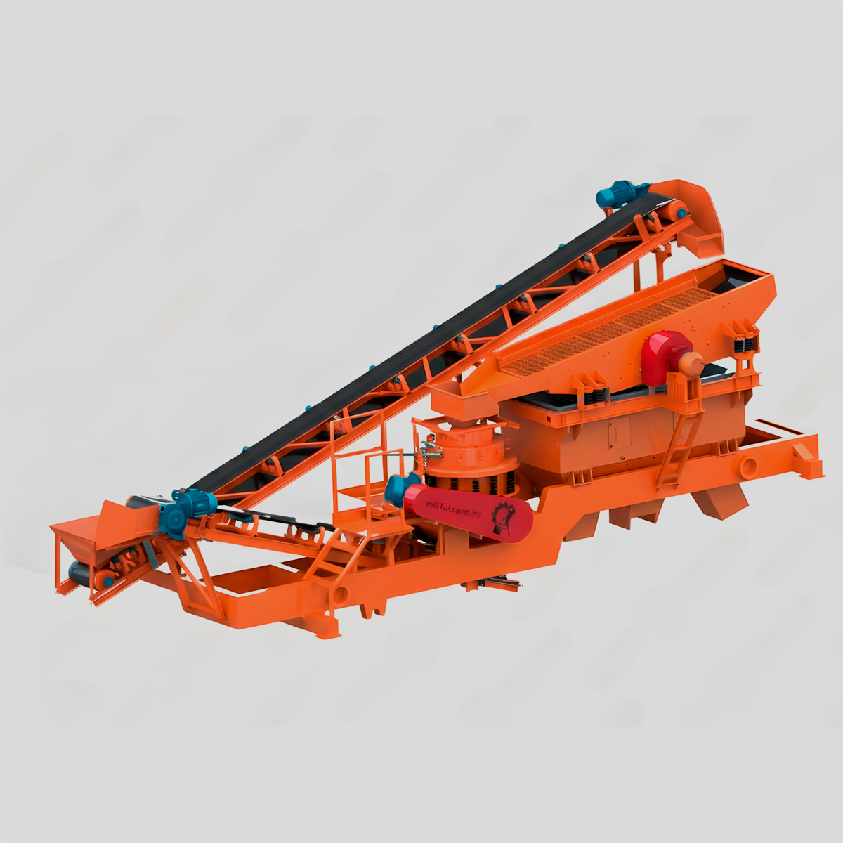 Из приемного бункера пластинчатый питатель осуществляет равномерную подачу материала в щековую дробилку первой стадии СДС4/9. Там происходит первичное разрушение материала и перемещение его на ленточный конвейер. Вторая стадия дробления осуществляется в конусной дробилке КД-600, откуда материал по ленточному конвейеру поступает на товарную сортировку в инерционном грохоте СМ. Товарная продукция и отсев дробления отгружаются в конуса при помощи отсыпных конвейеров (ширина ленты 650 мм, длина 12м, угол установки до 17 градусов).