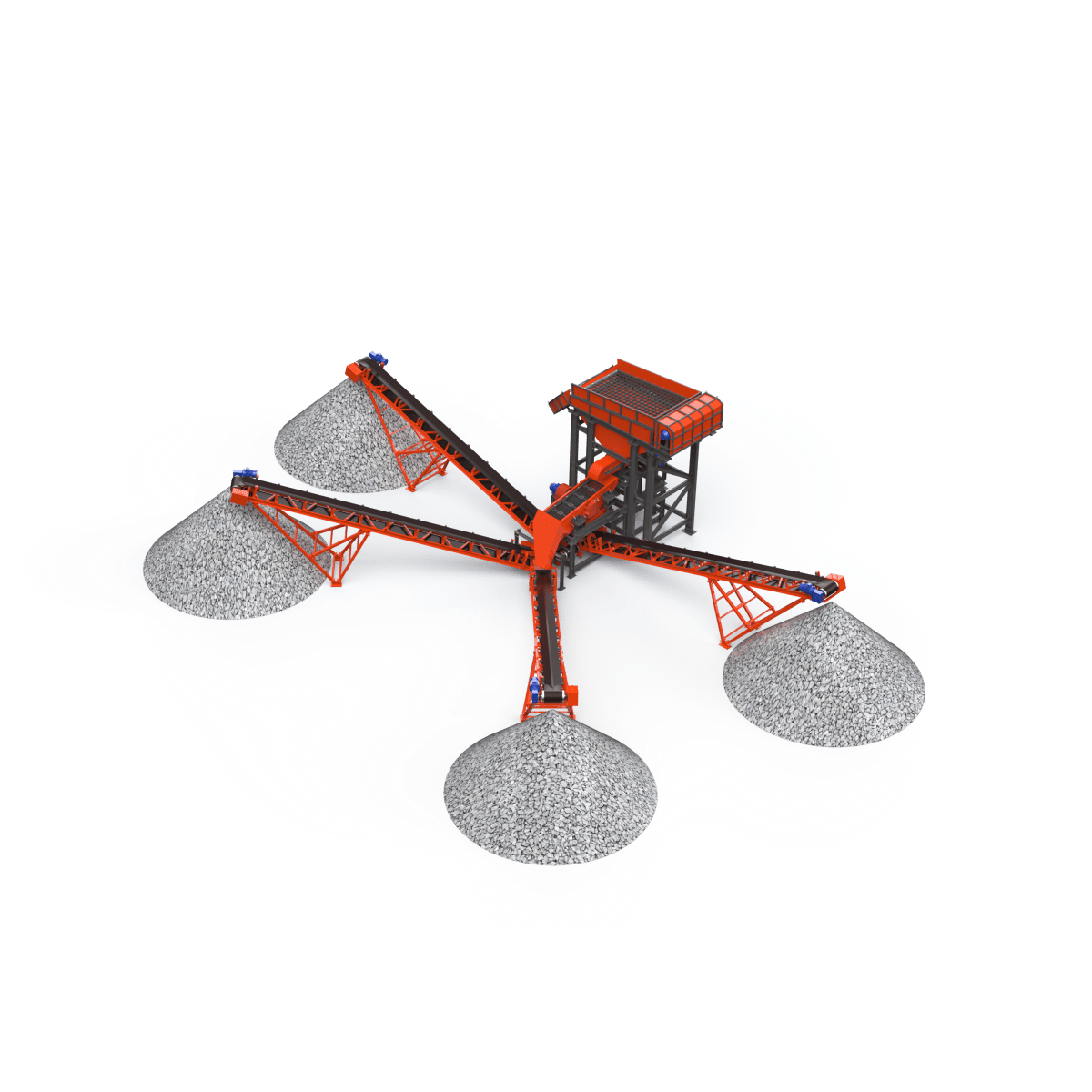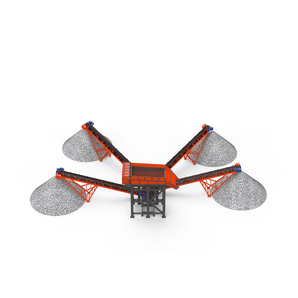 Материал, прошедший через отверстия первого сита, аналогичным образом рассеивается на следующем сите на два класса по крупности. Самый крупный материал попадает в приемную емкость (течку), расположенную под выгрузным отверстием грохота. Выгрузка материала с сит осуществляется воронками. Форма и размер приемного бункера зависит от условий эксплуатации, физико-механических свойств загружаемого материала и желания Заказчика.
