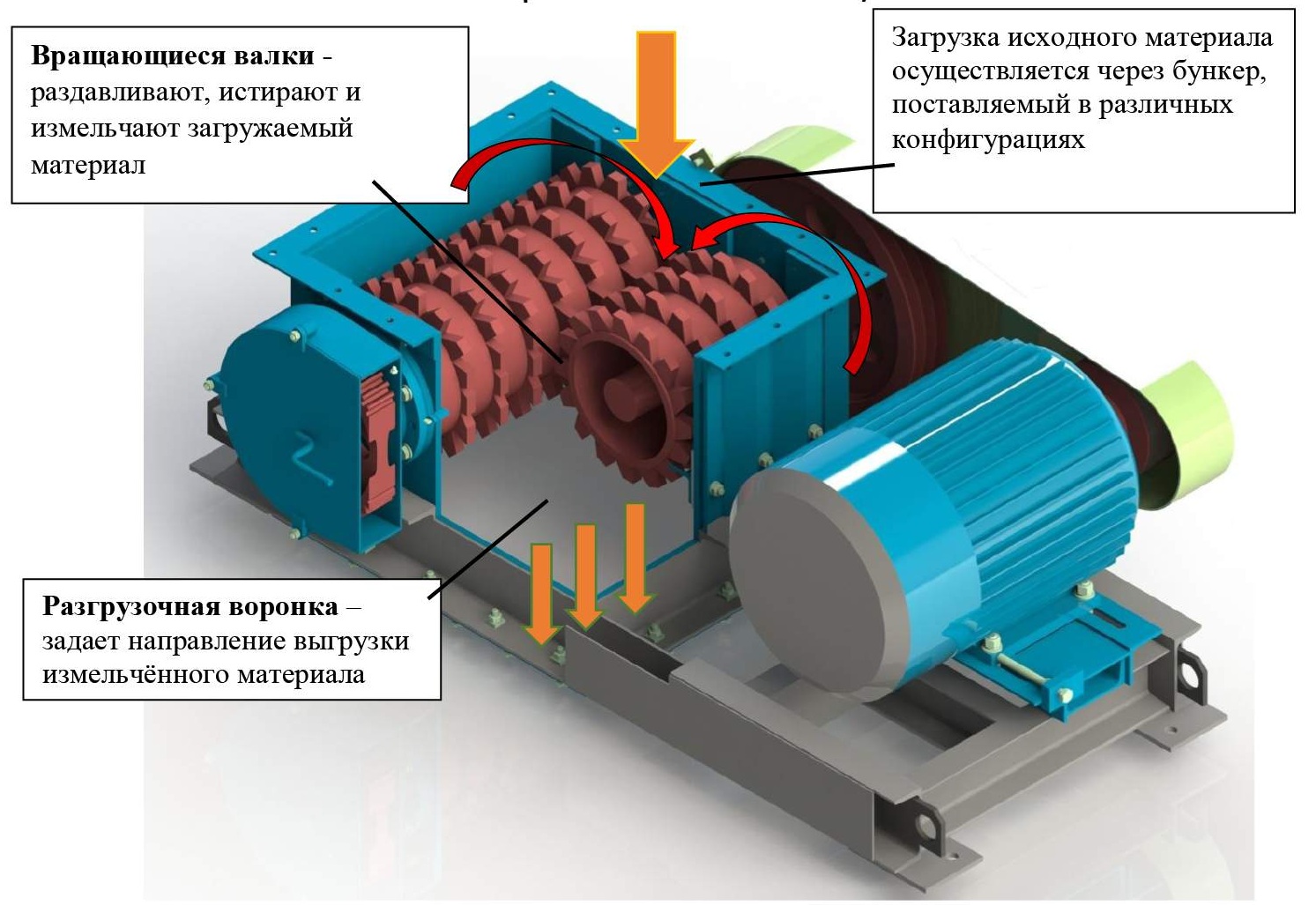 Зубчатая конструкция рабочих органов обеспечивает стабильную работу с материалами различной плотности и влажности, снижает образование мелочи и пыли, а также позволяет поддерживать устойчивый режим переработки при непрерывной загрузке. Оборудование отличается простой и надёжной конструкцией, рассчитанной на длительную промышленную эксплуатацию.