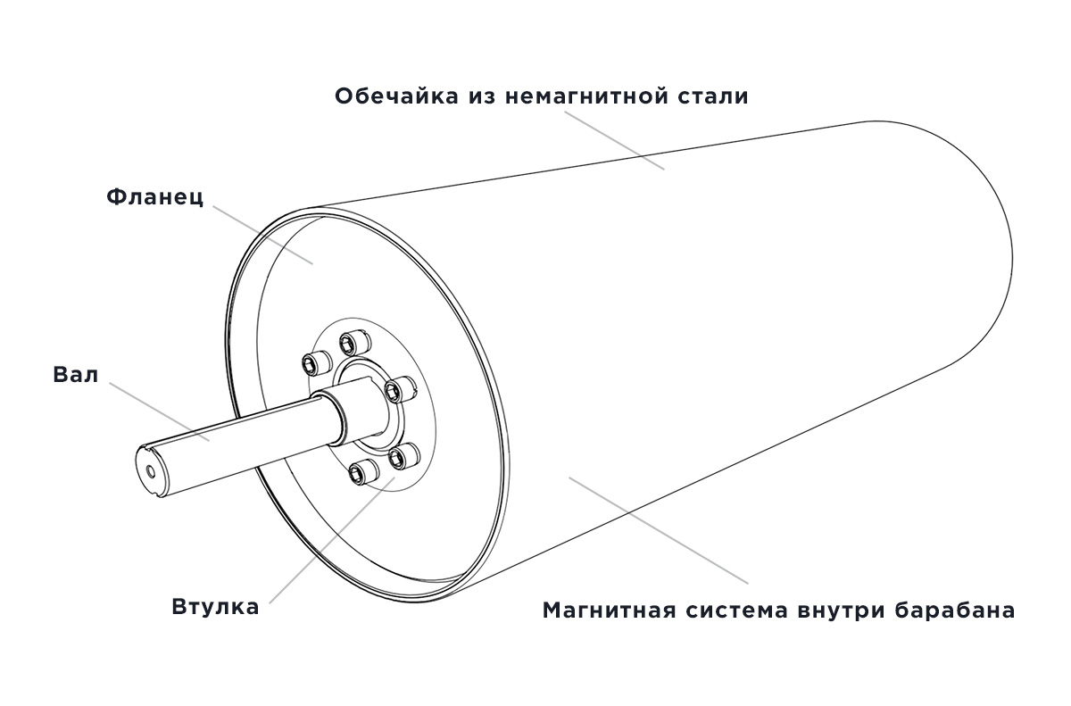 Барабан МБФ, представляет собой сложную магнитную систему, расположенную внутри цилиндрического корпуса. Для создания магнитного поля в наших сепараторах используются мощные неодимовые магниты.