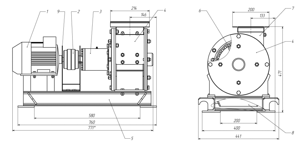 Привод осуществляется от электродвигателя (поз. 1) посредством втулочно-пальцевой муфты (поз. 2). Ротор (поз. 6), смонтирован в подшипниковых опорах (поз. 3), установленных на корпусе (поз. 4). Электродвигатель и корпус установлены на общей раме (поз. 5). Загрузка исходного материала производится через патрубок загрузки (поз. 7). В нижней части дробилки находится разгрузочное устройство (поз. 8) через которое осуществляется разгрузка материала в транспортную тару или на транспортную систему. Наружные вращающиеся части ограждены кожухом (поз. 9).
