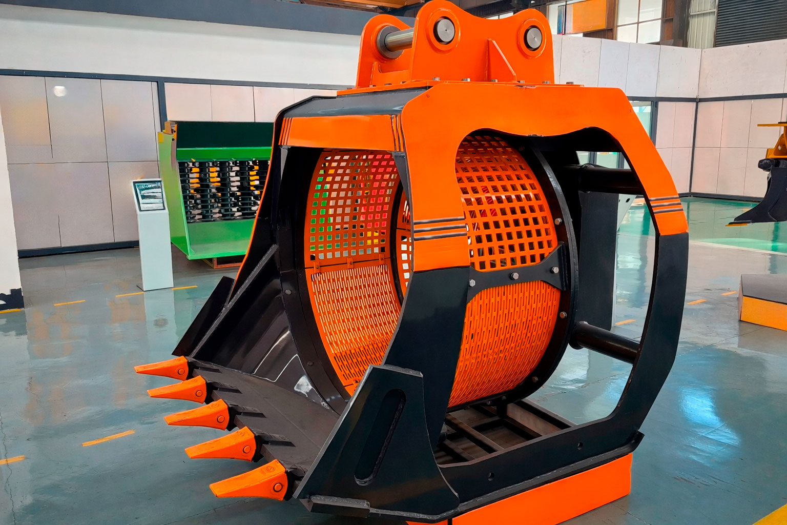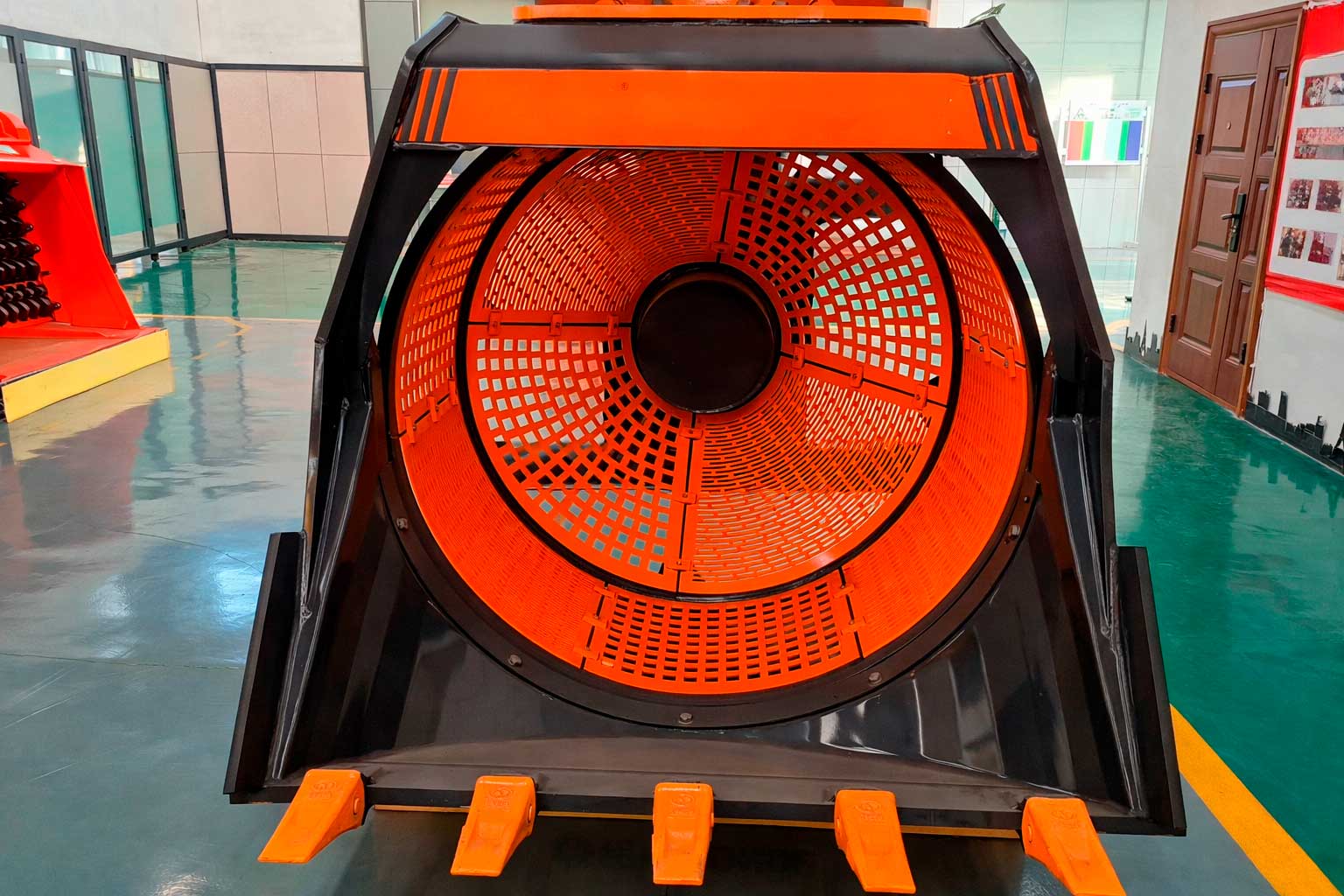 Благодаря вращающемуся барабану с просеивающей сеткой материал равномерно перемешивается и просеивается. Такая технология значительно снижает вероятность забивания отверстий, даже при работе с влажными или липкими материалами. Это делает роторный ковш идеальным решением для работы в карьерах, на строительных площадках, при дорожных работах и переработке грунта.