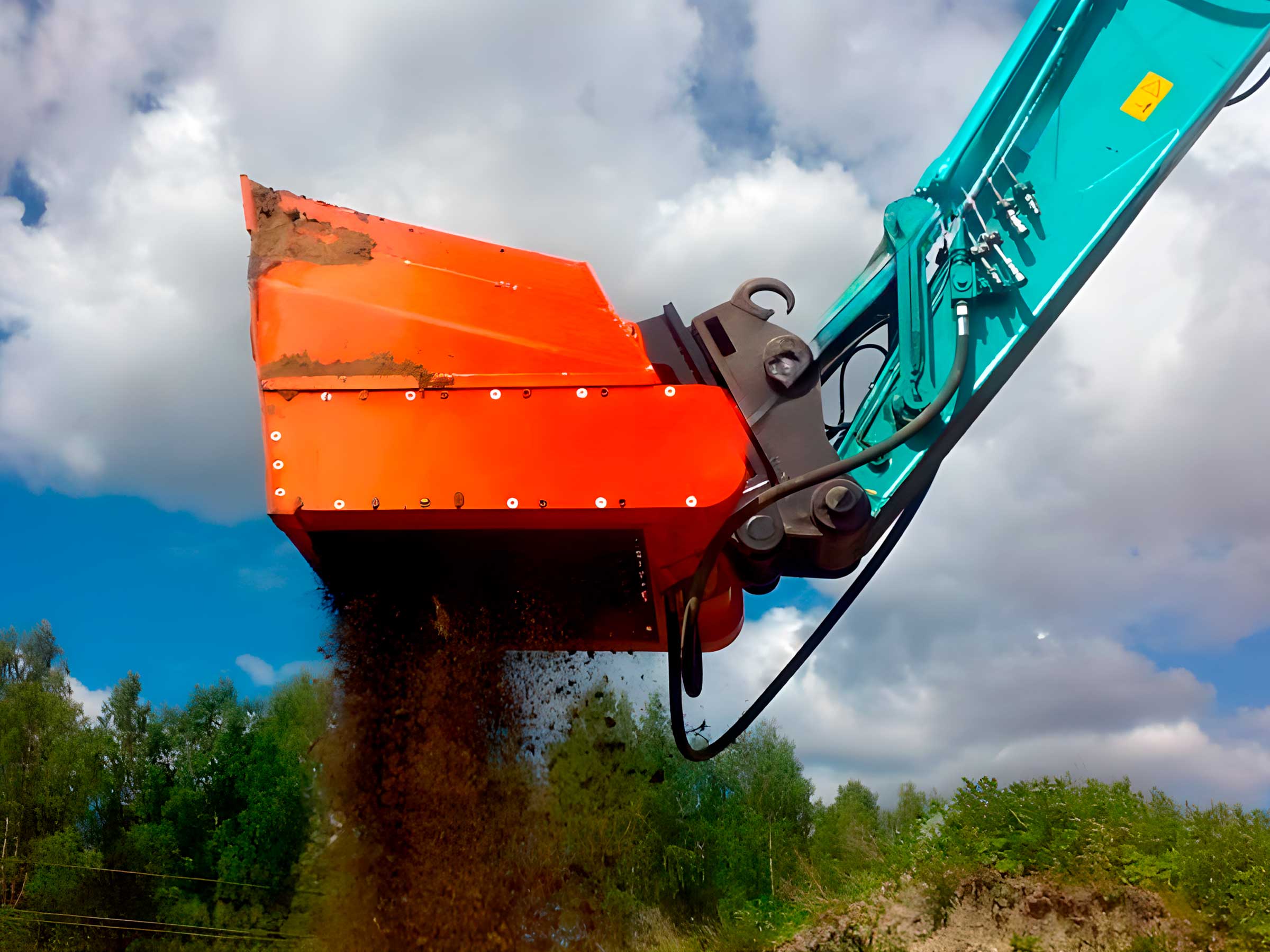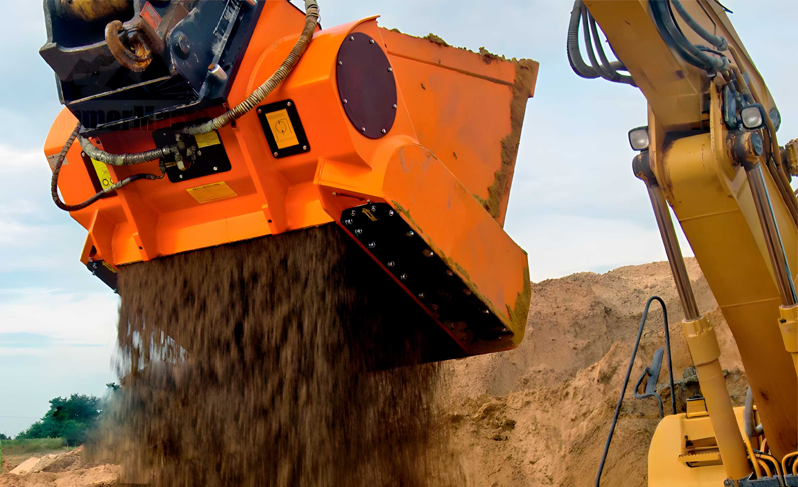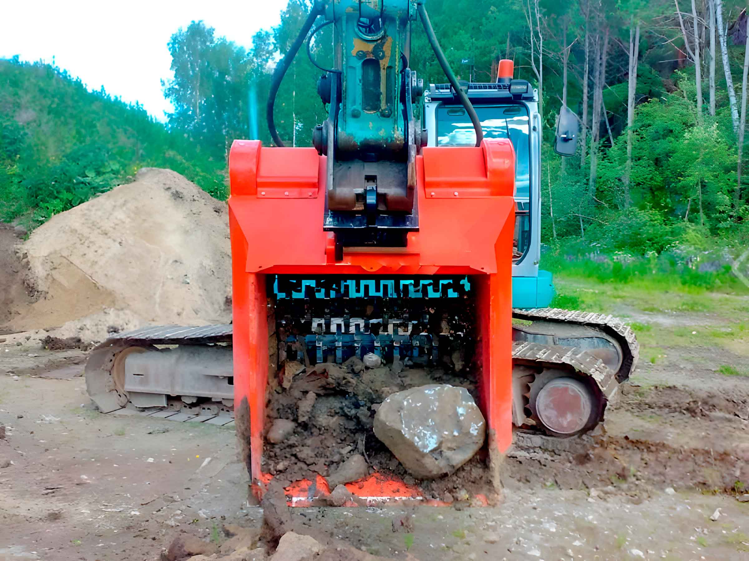 Ковш одновременно выполняет дробление, просеивание и перемешивание материалов, что делает его универсальным инструментом для строительства, переработки грунта и работы с отходами.