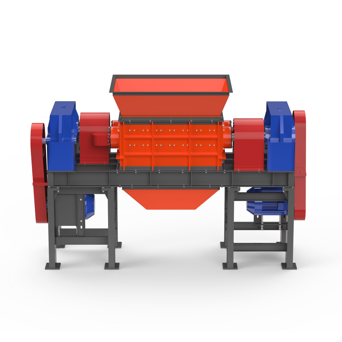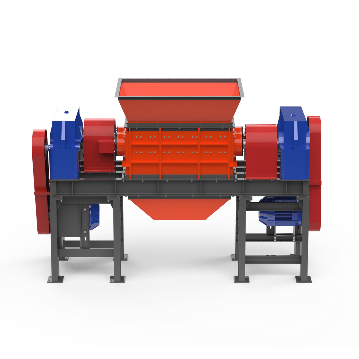 Шредер состоит из двух дисковых роторов, установленных в корпусе на подшипниковых опорах и приводимых в движение электродвигателями через ременные передачи. Материал загружается в бункер, под действием собственного веса попадает в зону резания, где захватывается и измельчается дисками роторов за счёт удара и истирания.