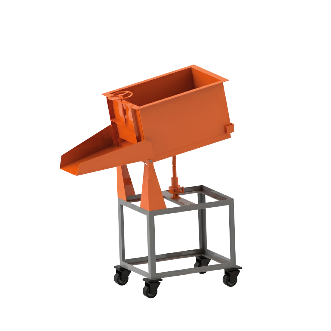 Кантователь включает в себя: раму, установленную на прорезиненных колесиках, для удобного перемещения кантователя по производственной площадке; откид с направляющим лотком, обеспечивающий разгрузку кантователя; гидравлический домкрат, предназначенный для подъема откида и (в случае комплектации) разгрузочную тару с винтовой заслонкой для дозировки подачи материала.