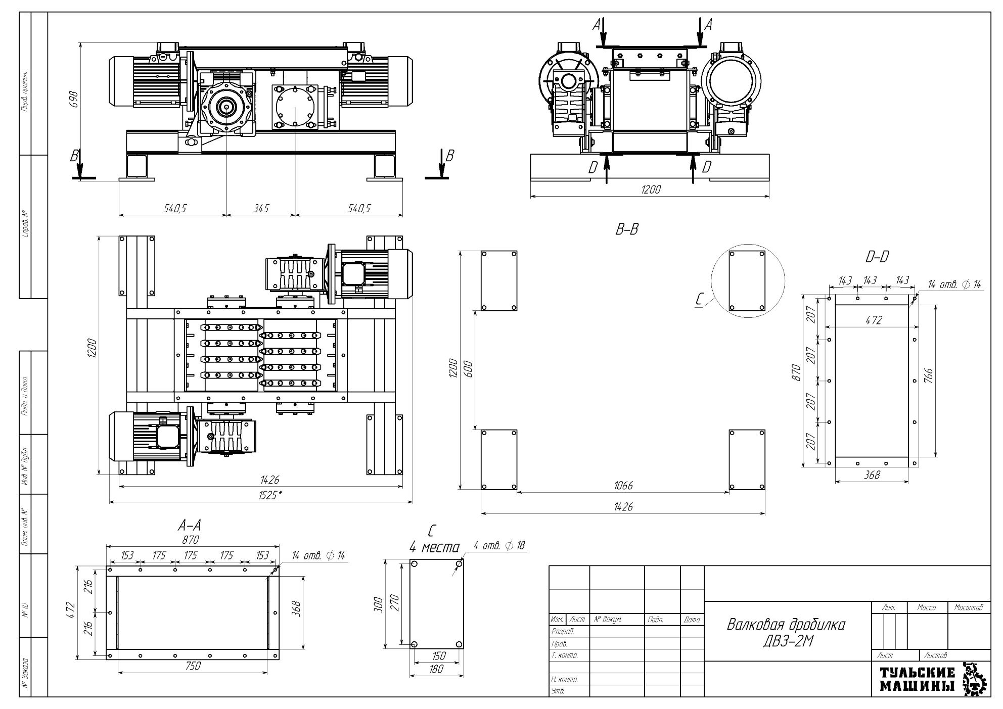 ДВЗ-2M – двухвалковая дробилка с рифлено-зубчатыми валками, предназначенная для среднего дробления хрупких материалов (отходы стекла, керамики), а также материалов низкой и средней прочности.