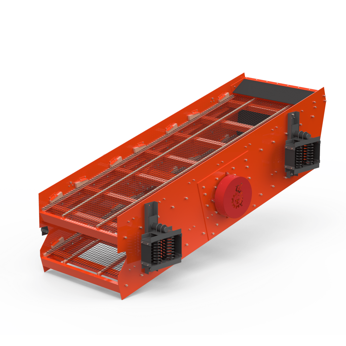 Материал для разделения поступает в грохот через загрузочный люк. Затем сырье при помощи вынуждающей силы вращения дебалансов вибратора подбрасывается, после чего начинает двигаться по наклонной верхней просеивающей поверхности в сторону выгрузки. При движении материала он просеивается сквозь сито.