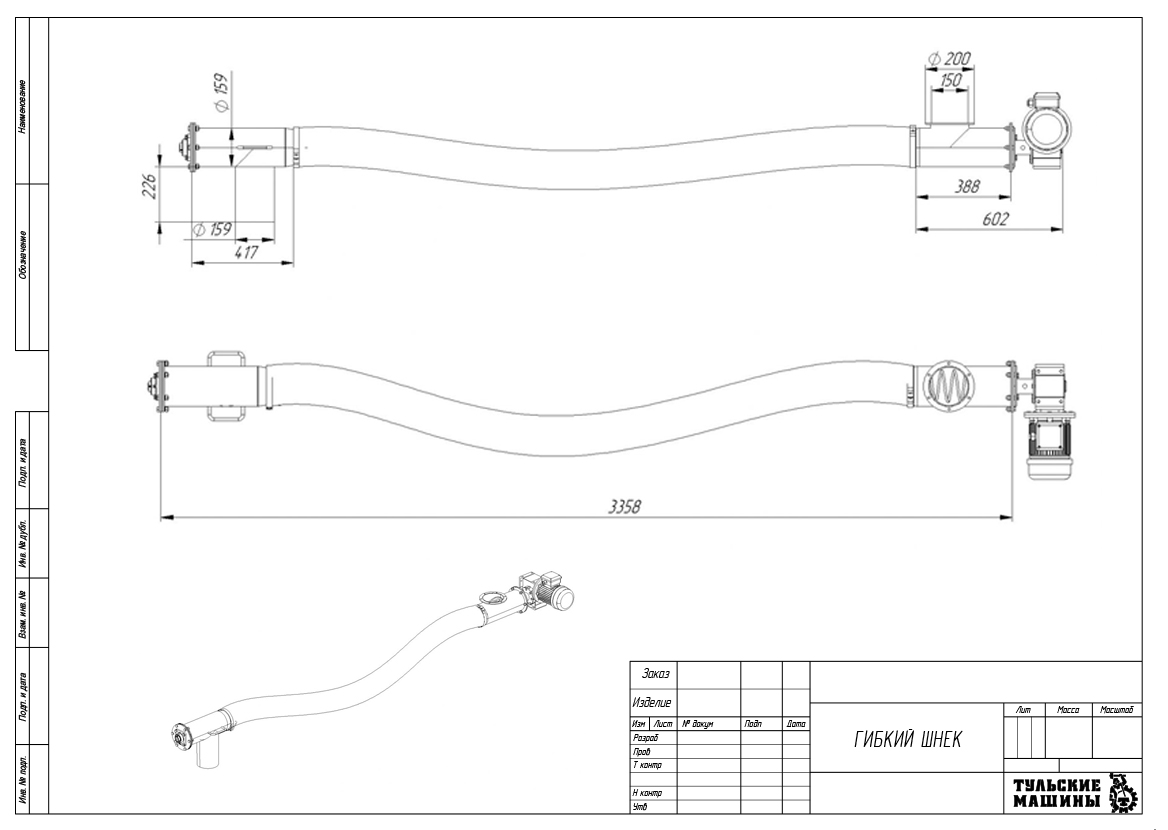 Гибкий шнек состоит из модуля загрузки материала, гибкой спирали в корпусе, разгрузочного модуля и приводной станции с электродвигателем и редуктором. При необходимости гибкий шнек может быть выполнен в комплектации с расходным бункером в зоне загрузки или специальным патрубком в зоне выгрузки. Подающая спираль гибкого шнека выполняется из углеродистой и нержавеющей стали, она должна быть гибкой для придания необходимой формы, иметь высокую износостойкость. Спираль гибкого шнека никогда не выполняется сварной. Концы подающей спирали крепятся в подшипниковых опорах, одна из которых устанавливается на валу приводной станции, а другая – в районе разгрузочного модуля. При включении электропривода спираль вращается и перемещает попавший в межвитковое пространство материал вдоль гибкого корпуса к разгрузочному модулю. Корпус спирального конвейера представляет собой трубу, выполненную из устойчивого к абразивному износу полимерного материала. Дополнительная защита корпуса от износа осуществляется при помощи оригинального технического решения: тщательно выверенный кольцевой зазор между внутренними стенками корпуса и спиралью оказывается постоянно заполненным транспортируемым материалом, который служит своеобразным щитом, предохраняющим корпус от износа. Для обеспечения герметичности корпуса в местах его крепления к загрузочному и разгрузочному модулям предусмотрены специальные уплотнительные элементы, которые могут располагаться в одном корпусе с подшипниковыми опорами, а могут быть от них изолированы.