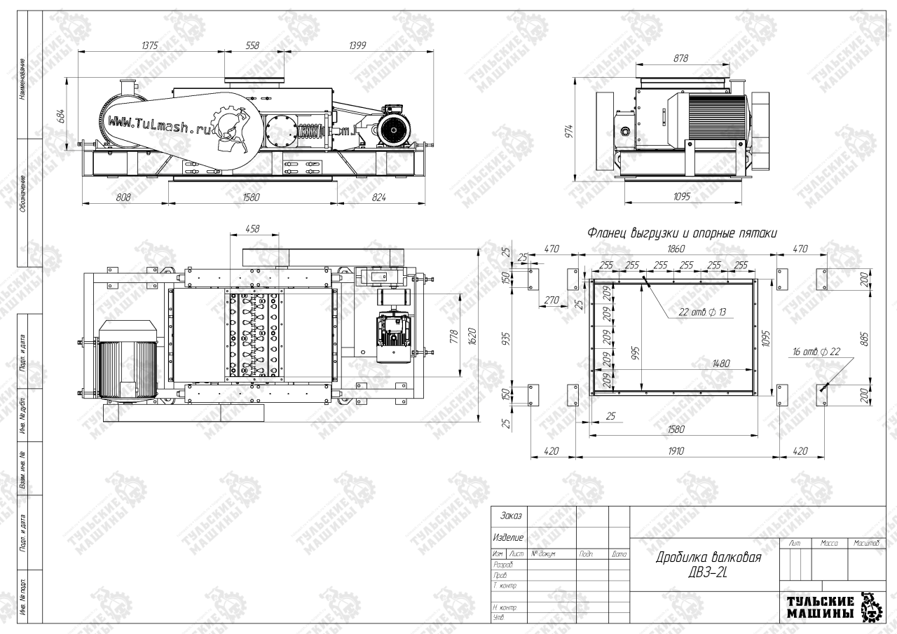 Габаритный и присоединительный чертёж валковой дробилки ДВЗ-2L.