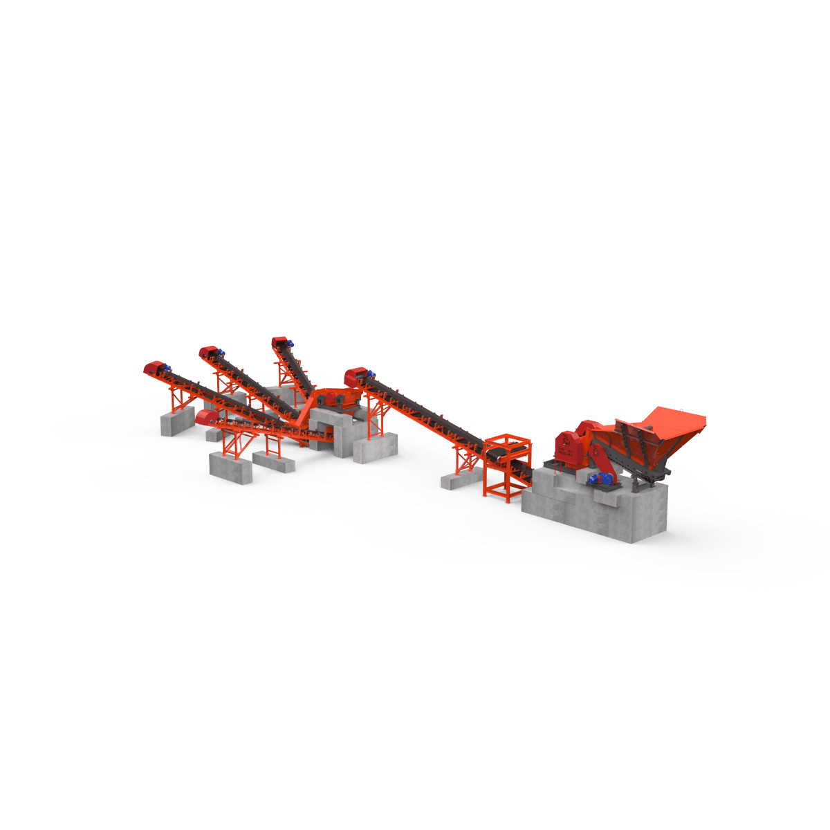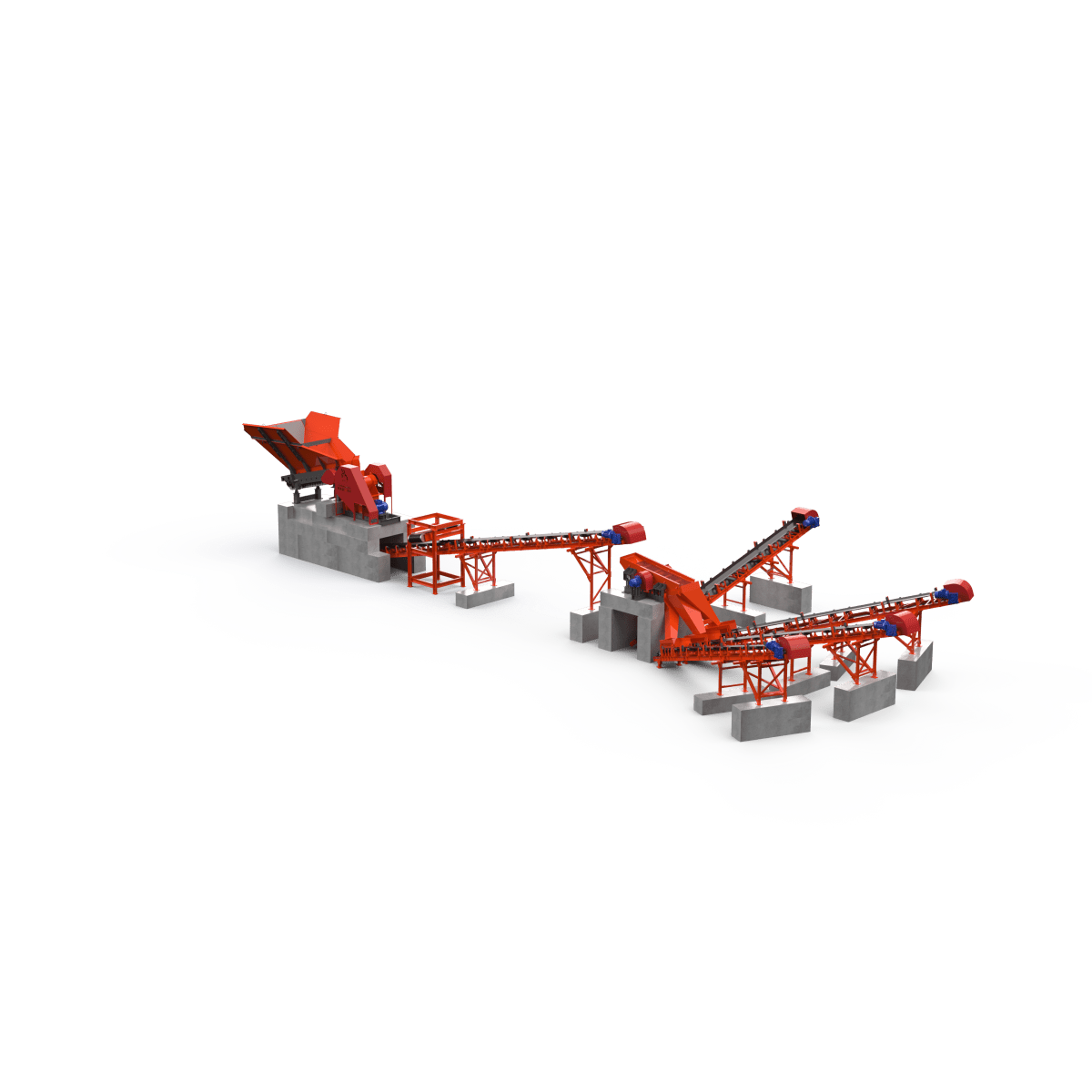 Линия переработки бетона на основе щековой дробилки СДС- 4/6, которая предназначена для дробления твердых рудных пород, минералов, некоторых видов металла, шлаков, бетона. В данную дробилку с помощью пластинчатого питателя П-804 подается материал. В случае заказчика это бетонные блоки. После раздробления бетонных конструкций, вторичный щебень с металлическими включениями, попадает на ленточный конвейер КЛ- 500/9000, где проходит через подвесной магнитный сепаратор, который забирает все металлические включения из раздробленного материала. Далее, конвейер перемещает переработанное сырье в инерционный грохот ГСЛ-2/3Д, который сортирует материал по фракциям 5-20, 20-40, 40-70, и отсев 0-5. После чего, готовый материал с помощью конвейеров отсыпается в насыпной конус.