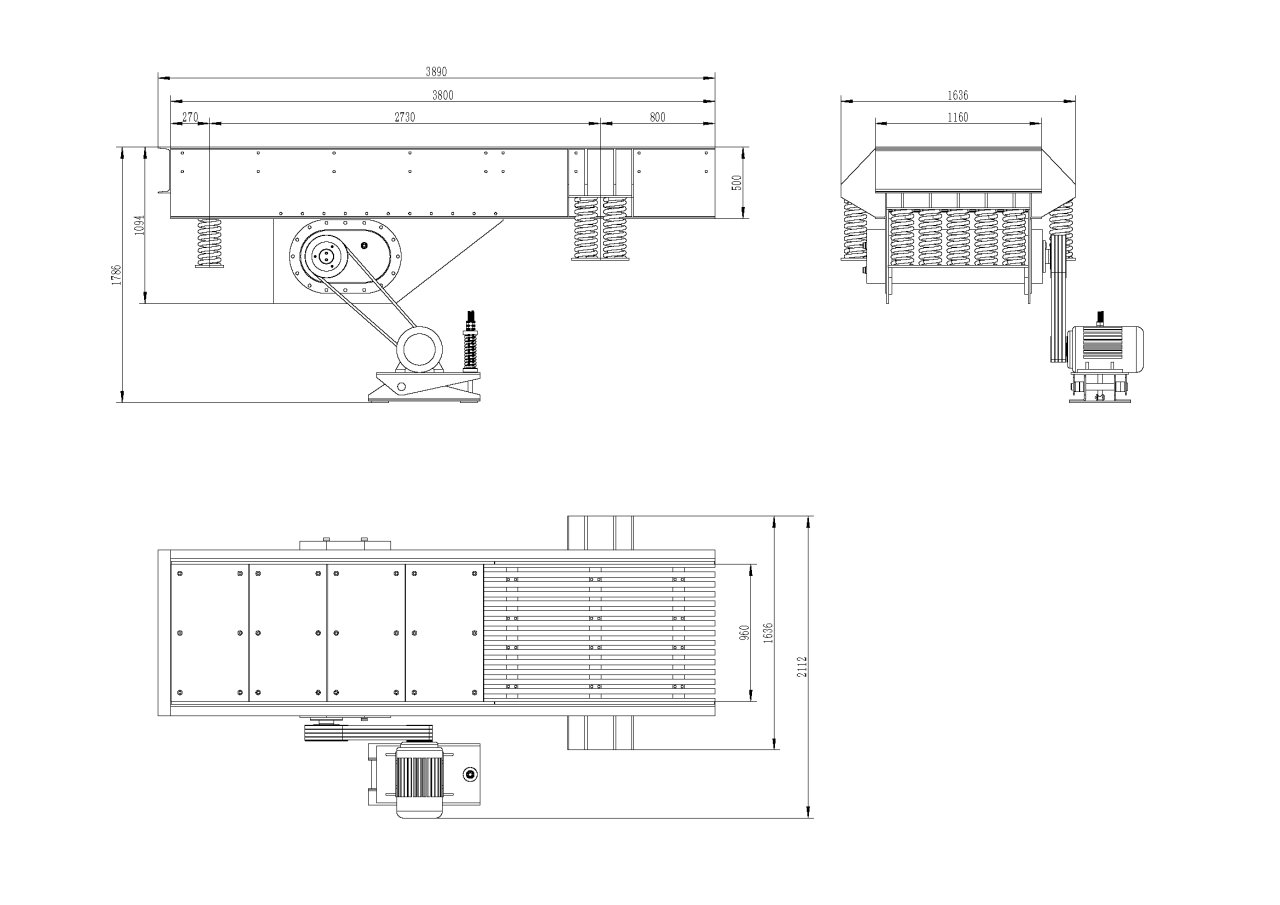 Вибропитатель состоит из корпуса, внутренней футеровки, пружинных блоков, блока дебалансов, площадки двигателя, двигателя и колосниковой решетки (данная опция не входит в стандартное исполнение и обговаривается индивидуально)