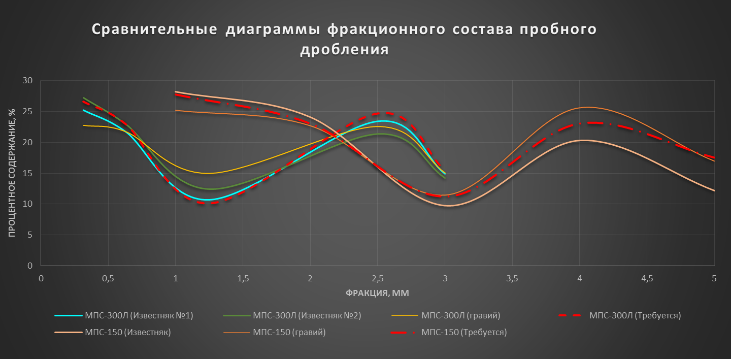 Таким образом, проводя сравнительную характеристику полученных результатов, видна общая закономерность распределения требуемого фракционного состава с полученным. Различие в графиках распределения фракционного состава обусловлено разными физико-механическими свойствами горных пород.