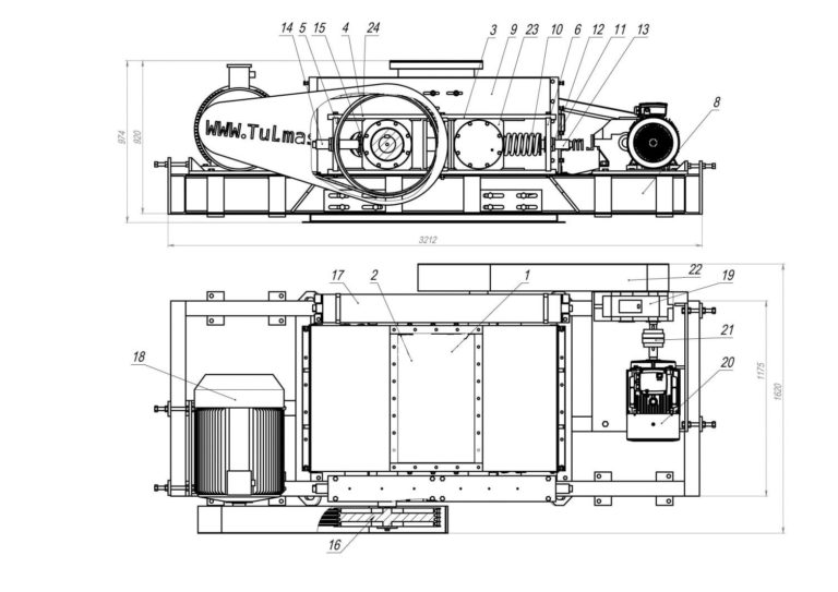 Дробилка представляет собой сварную раму (8), на ней смонтирован корпус (9) с подвижным (1) и неподвижным (2) валками, установленными в подшипниковых опорах. Корпуса подшипников устанавливаются между упорами (5) и (6), в которых есть пазы под направляющие, перемещением по которым осуществляется регулировка зазора и отвод подвижного валка (1) при попадании недробимых предметов. При попадании между валками сверхмерного или недробимого куска сжимаются амортизирующие пружины. Регулировка зазора осуществляется при помощи винта (13).