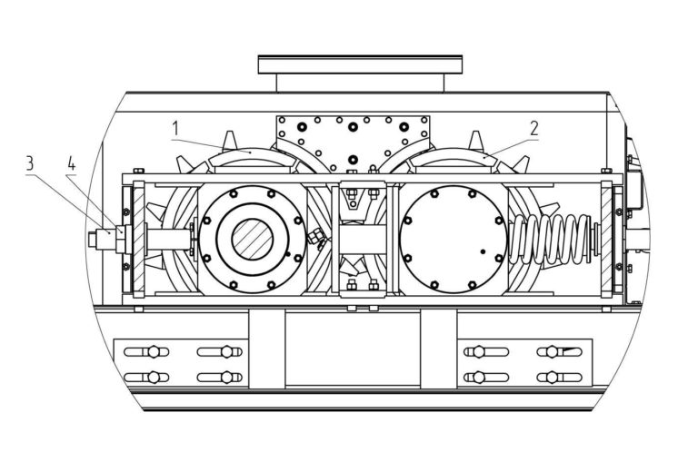 Регулировка зазора между подвижным (2) и неподвижным (1) валками осуществляется с помощью винтов (2 шт.) регулировки зазора (3), расположенных с двух сторон дробилки. Для регулировки зазора необходимо раскрутить две контргайки (4) и с помощью винтов (3), поворачивая по очереди регулировочный винт по часовой стрелке или против нее, в зависимости от необходимости уменьшить или увеличить зазор между подвижным и неподвижным валками. Винты должны быть выкручены (закручены) одинаково с двух сторон, чтобы не было перекоса неподвижного валка. При сведении валков необходимо учитывать высоту зуба накладки: зубья валка не должны касаться накладки противоположного валка, (при запуске дробилка может выйти из стоя, если произойдет удар валков друг об друга). После выставления необходимого зазора между валками для фиксации винта (3) следует закрутить две контргайки (4).